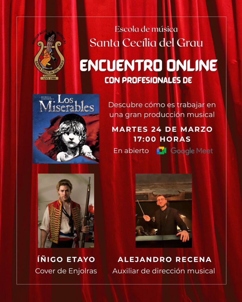Amb motiu de la pròxima escapada musical a Madrid que ha organitzat la nostra Agrupació, en la qual assistirem a diversos esdeveniments, com la sarsuela Jugar con fuego, la Simfonia núm. 4 de Brahams i el musical Los miserables, esta vesprada hi haurà una trobada en línia amb artistes d’este musical que ens contaran la seua experiència en este tipus d’espectacles i com s’organitza una producció tan complexa.