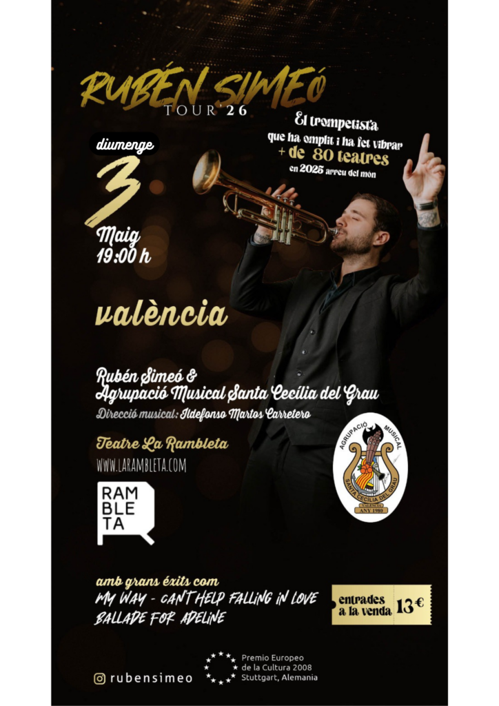 El reconegut trompetista Rubén Simeó, acompanyat per la banda titular de Santa Cecília del Grau, oferix este diumenge a La Rambleta un concert molt especial.
